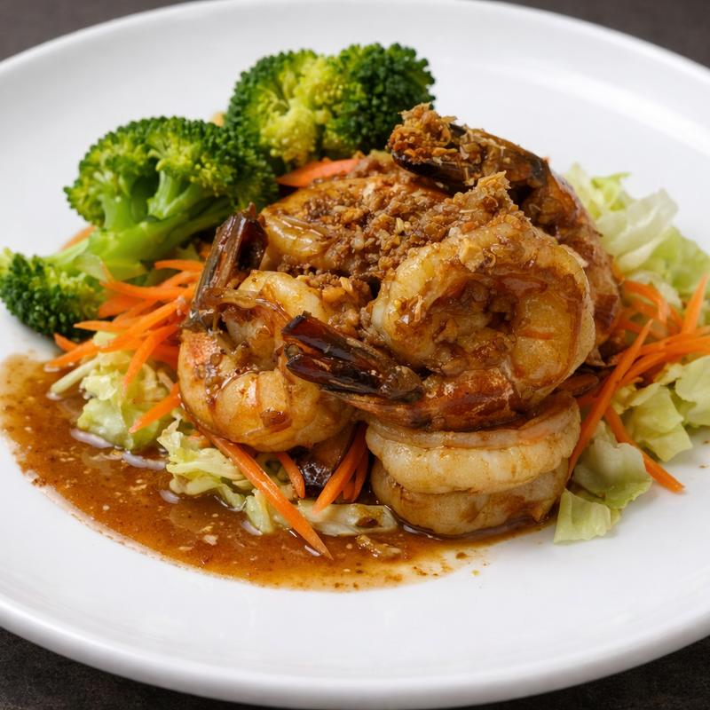 Tiger prawns tossed in fresh garlic and house sauce, lightly seasoned with white pepper. Served with broccoli & carrots.